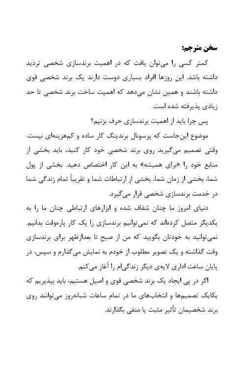 دنیای امروز ما چنان شفاف شده و ابزارهای ارتباطی چنان مارا به یکدیگر متصل کرده اند که نمی توانیم برندسازی را یک کار پاره وقت بدانیم. نمی توانید به خودتان بگویید که من از صبح تا بعدازظهر برای برندسازی وقت گذاشته و یک تصویر مطلوب از خودم به نمایش می گذارم و سپس، در پایان ساعت اداری لایه ی دیگر زندگی ام را آغاز می کنم.
