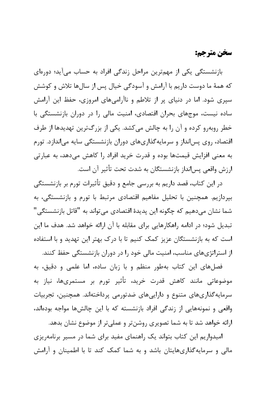 در این کتاب قصد داریم به بررسی جامع و دقیق تاثیرات تورم بر بازنشستگی، به شما نشان می دهیم که چگونه این پدیده اقتصادی می تواند به (قاتل بازنشستگی) تبدیل شود; در ادامه راهکارهایی برای مقابله با آن ارائه خواهد شد. هدف ما این است که  به بازنشستگان عزیز کمک کنیم تا با درک بهتر این تهدید و با استفاده از استراتژی های مناسب، امنیت مالی خود را در دوران بازنشستگی حفظ کنند.