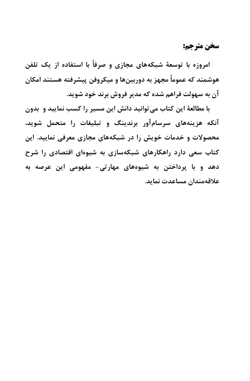 با مطالعه این کتاب می توانید دانش این مسیر را کسب نمایید و بدون آنکه هزینه های سرسام آور برندینگ و تبلیغات را متحمل شوید، محصولات و خدمات خویش را در شبکه های مجازی معرفی نمایید. این کتاب سعی دارد راهکارهای شبکه سازی به شیوه ای اقتصادی را شرح دهد و با پرداختن به شیوه های مهارتی- مفهومی این عرصه به علاقمندان مساعدت نماید.